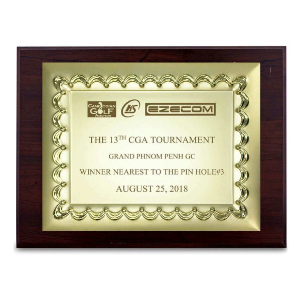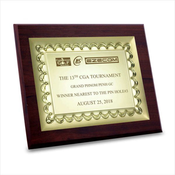 – Bảng vinh danh hình chữ nhật– Chất liệu: Đồng mạ vàng trên gỗ anh đào hình chữ nhật, với lựa chọn nâng cấp lên gỗ piano bóng sang trọng– Màu sắc: Vàng– Kích thước: 230x300mm– Thiết kế nội dung và khắc laser theo yêu cầu của khách hàng