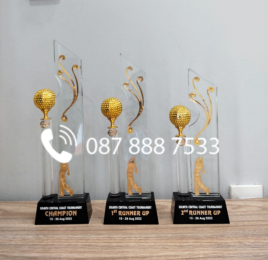 – Cúp Golf pha lê cao cấp gắn hoa văn + người golf vàng, sản phẩm có 3 size chuyên dùng trao tặng trong giải golf