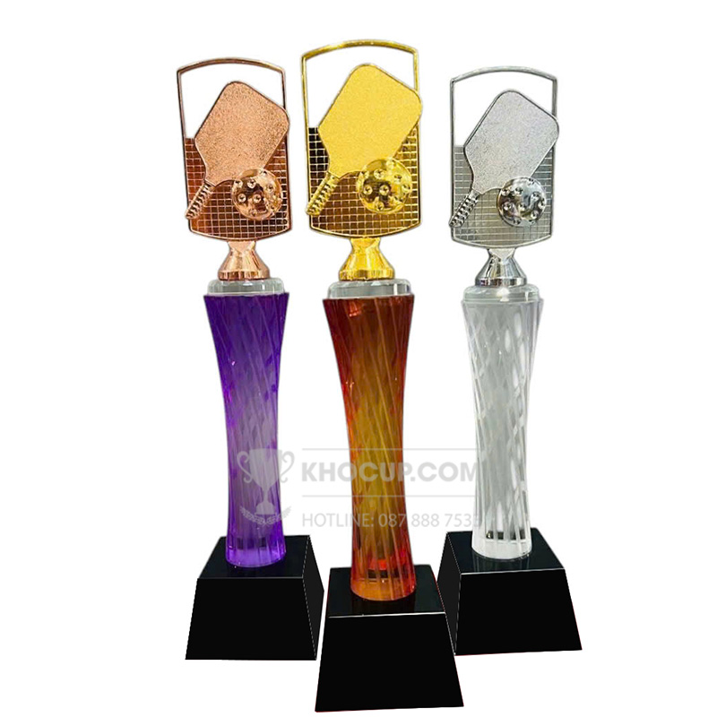 – Cúp Pickleball pha lê,đỉnh pick kim loại màu vàng,bạc,đồng– Chất liệu: Pha lê – Màu sắc: thân màu bạc,tím