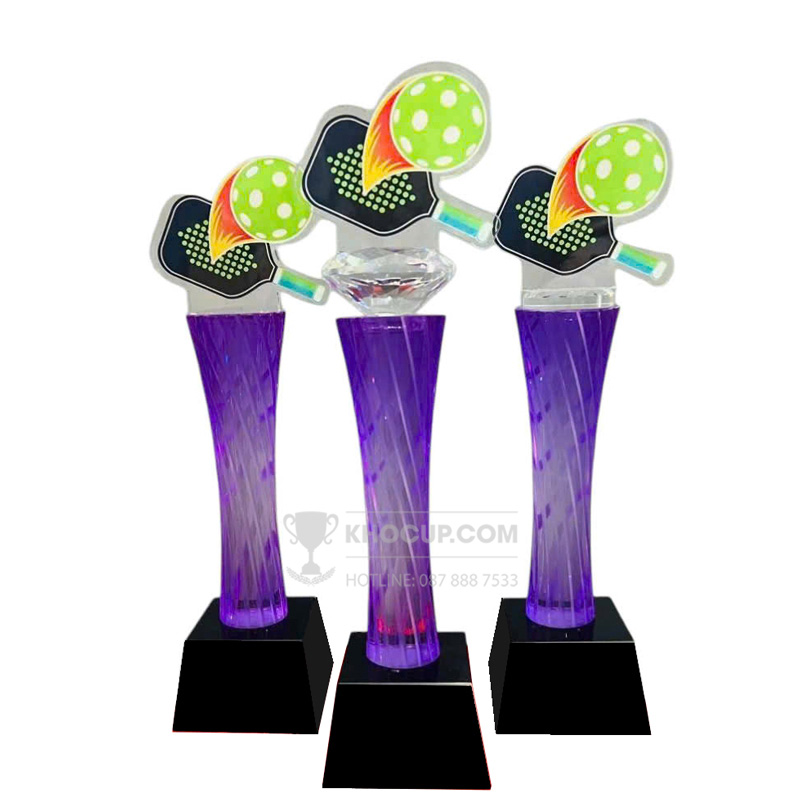 – Cúp Pickleball pha lê thân màu tím gắn đỉnh pickleball pha lê