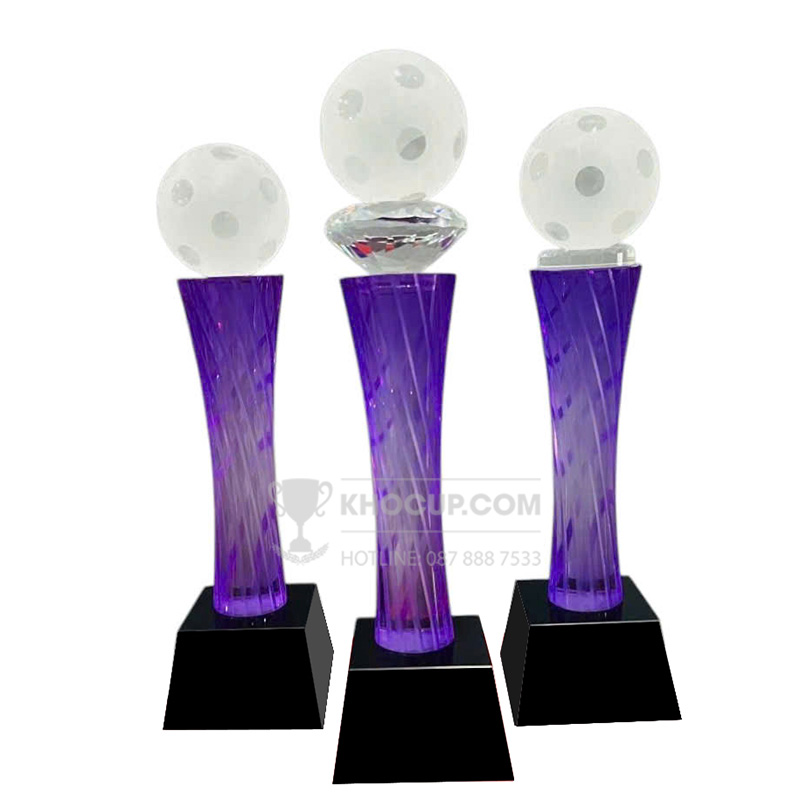 – Cúp Pickleball pha lê thân màu tím gắn quả bóng pickleball pha lê