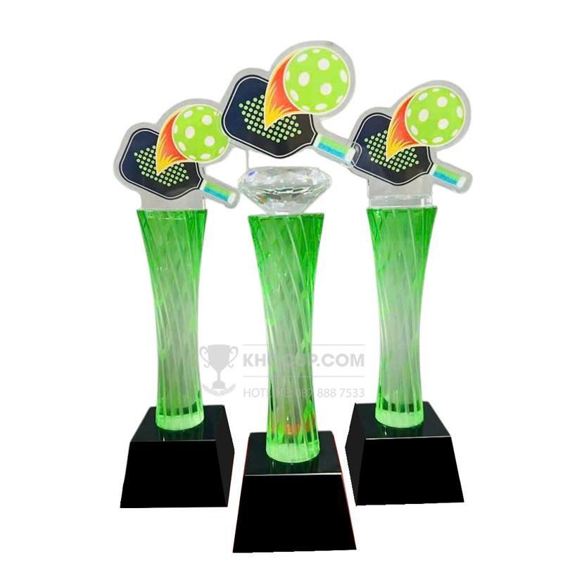 – Cúp Pickleball pha lê thân màu xanh, đỉnh pickleball pha lê