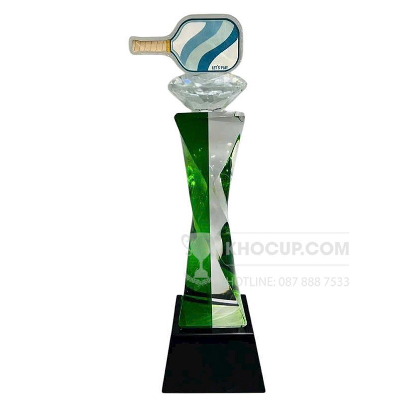 –Cúp Pickleball pha lê, thân màu xanh gắn vợt pickleball– Chất liệu: Pha lê– Màu sắc: xanh