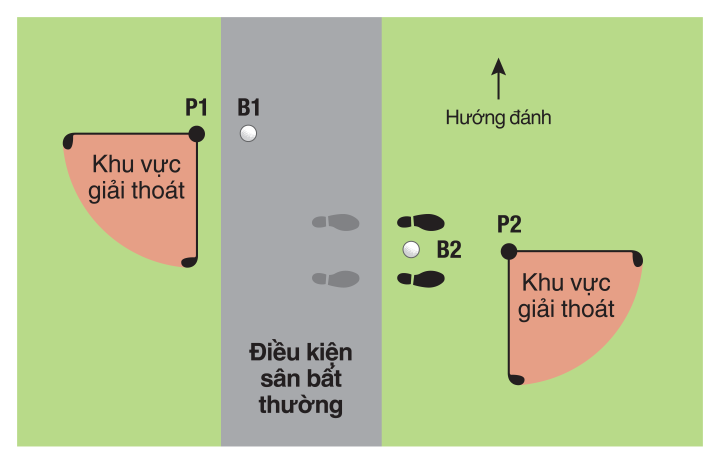 -Được phép giải thoát không phạt khỏi ảnh hưởng bởi điều kiện sân bất thường (ACC), bao gồm vật cản cố định, khi bóng chạm hoặc nằm trong hoặc trên điều kiện (B1), hoặc khi điều kiện ảnh hưởng đến thế đứng dự kiến (B2), hoặc khu vực swing dự kiến.