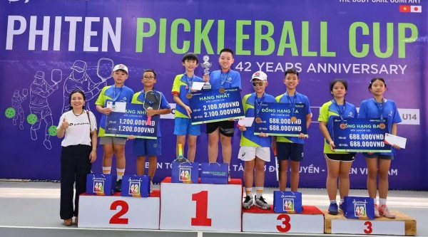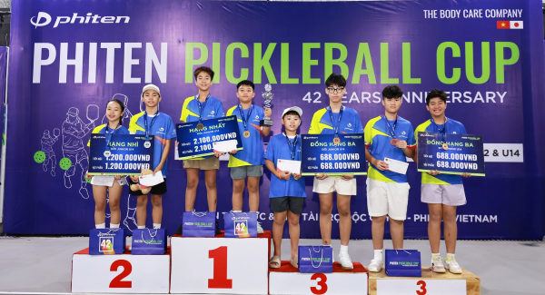 Giải pickleball Phiten Cup 2025 diễn ra nhân kỷ niệm 42 năm thành lập Phiten toàn cầu. Bên cạnh nội dung đôi nam nữ (hoặc đôi nữ) 5.0, đôi tự do 6.5, ban tổ chức còn tạo ra sân chơi miễn phí cho các VĐV nhí với 2 nội dung U.12 và U.14 thu hút gần 50 em tham gia, tạo không khí sôi nổi, hào hứng.